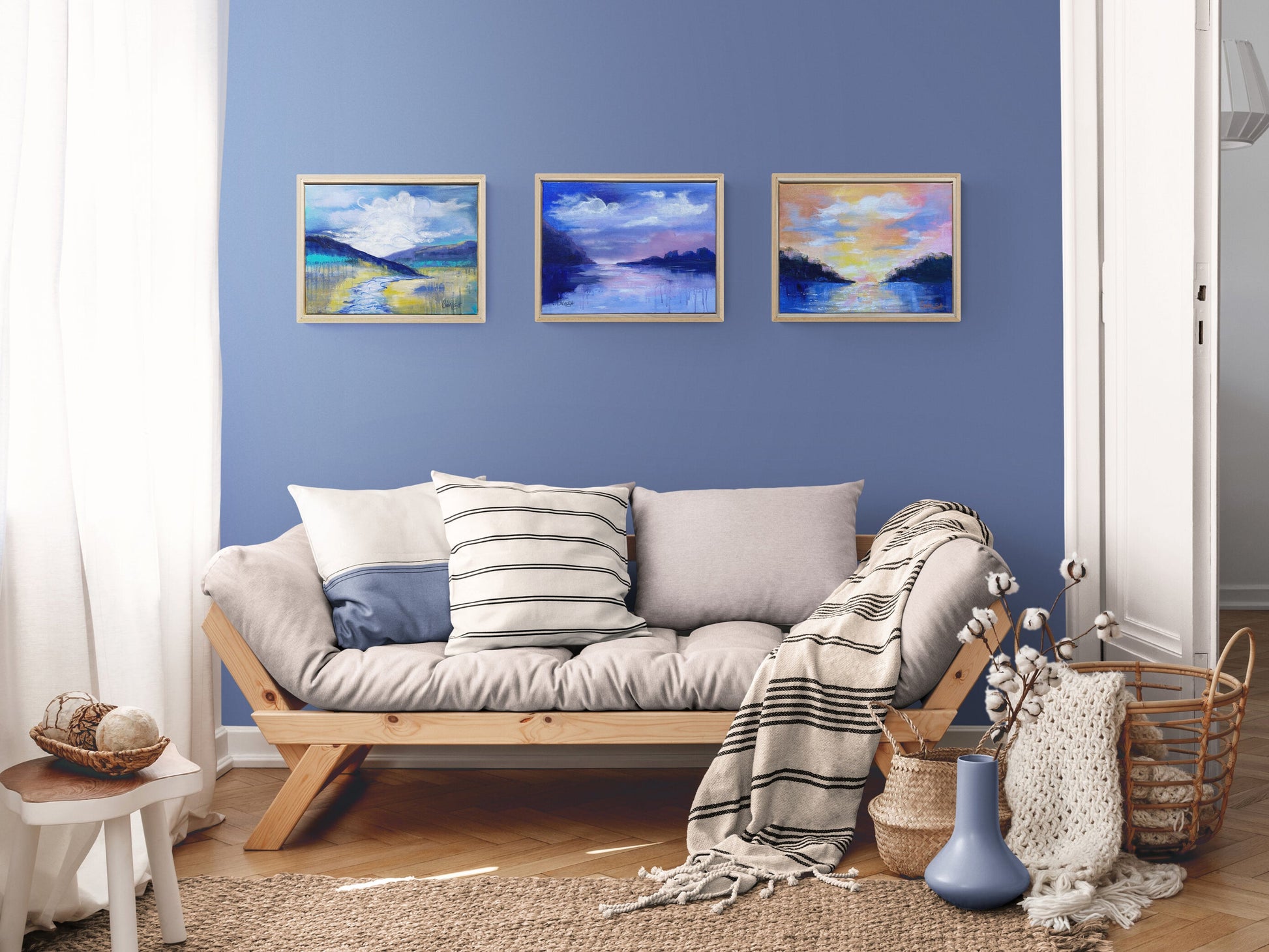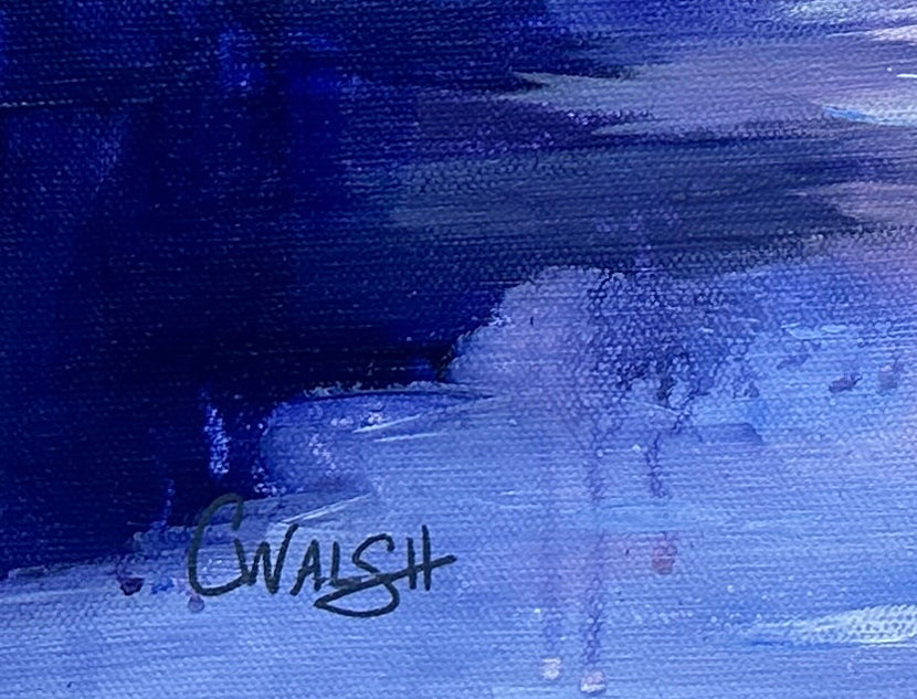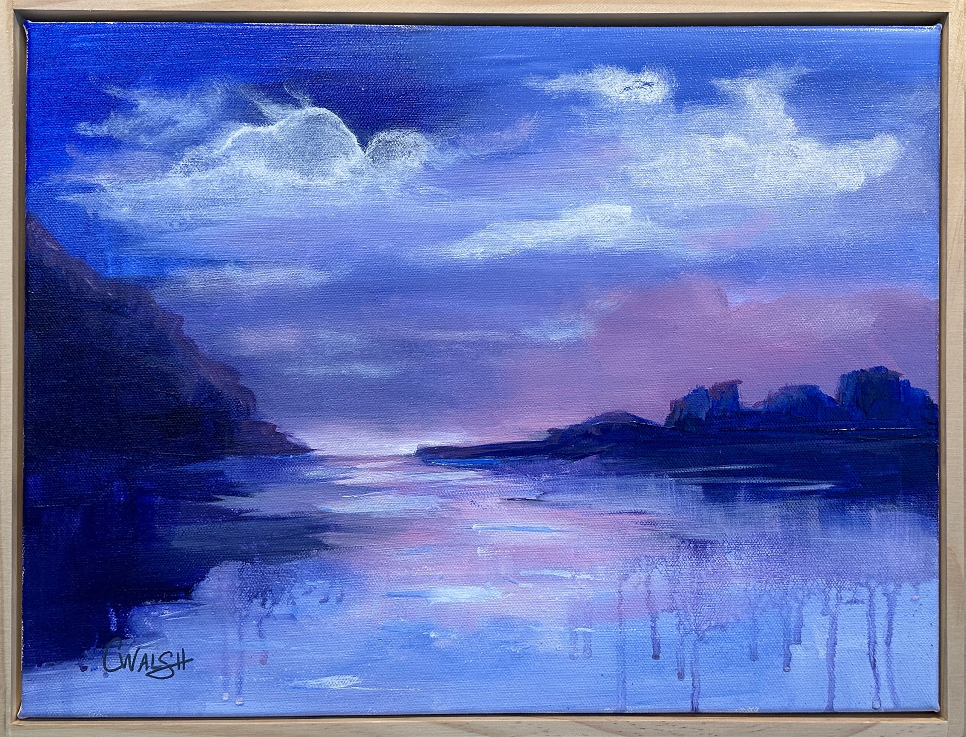 The moody painting captures the mystical allure of dusk along the Hawkesbury River. Brushstrokes of deep blues and purples meld seamlessly, evoking the tranquil transition from day to night. This abstract piece whispers secrets of nature's beauty, inviting viewers to immerse themselves in its serene, captivating atmosphere.