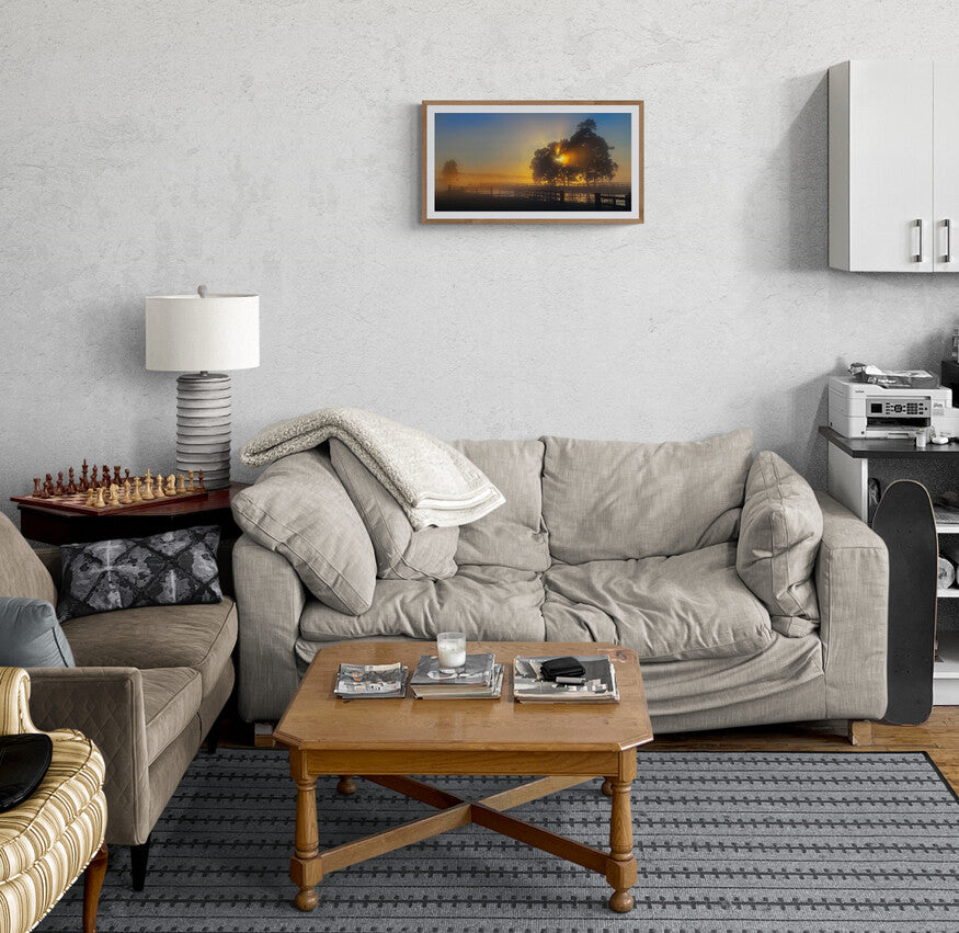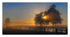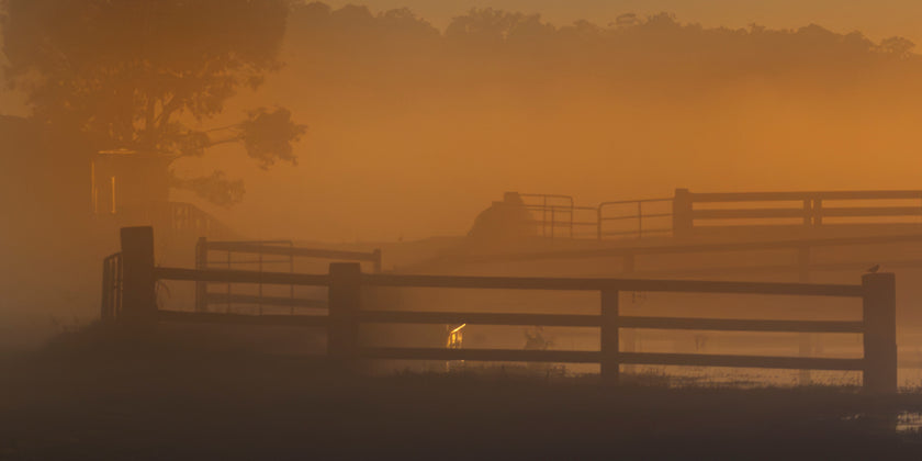 Witness the stunning splendor of an Australian sunrise with "Golden Sunrise Burst" - an original PanoScape photograph that captures the serene countryside, with a majestic tree, sunburst, and tranquil fog. The rustic charm of the fence and reflection adds a touch of nostalgia to inspire your day.