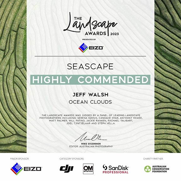 This Limited Edition Print of "Ocean Clouds" was entered in the Australian Landscape Awards and was recognised by peers as being Highly Commended. Judged among thousands of images it is an honour to have an image recognised by peers at this level.