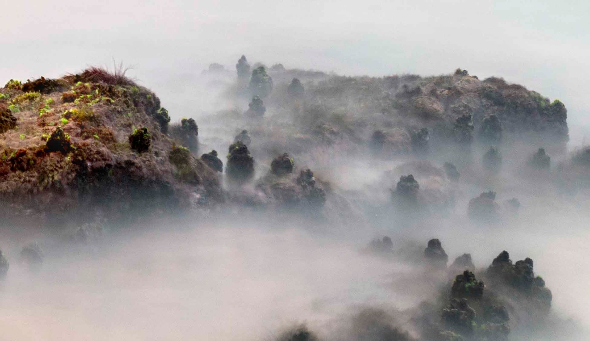 On opening the image on the computer back in the studio it looked like clouds wrapping around mountain tops. On first glance it was an optical illusion. Trees appear to reach above the clouds, the sun rising in the distance.